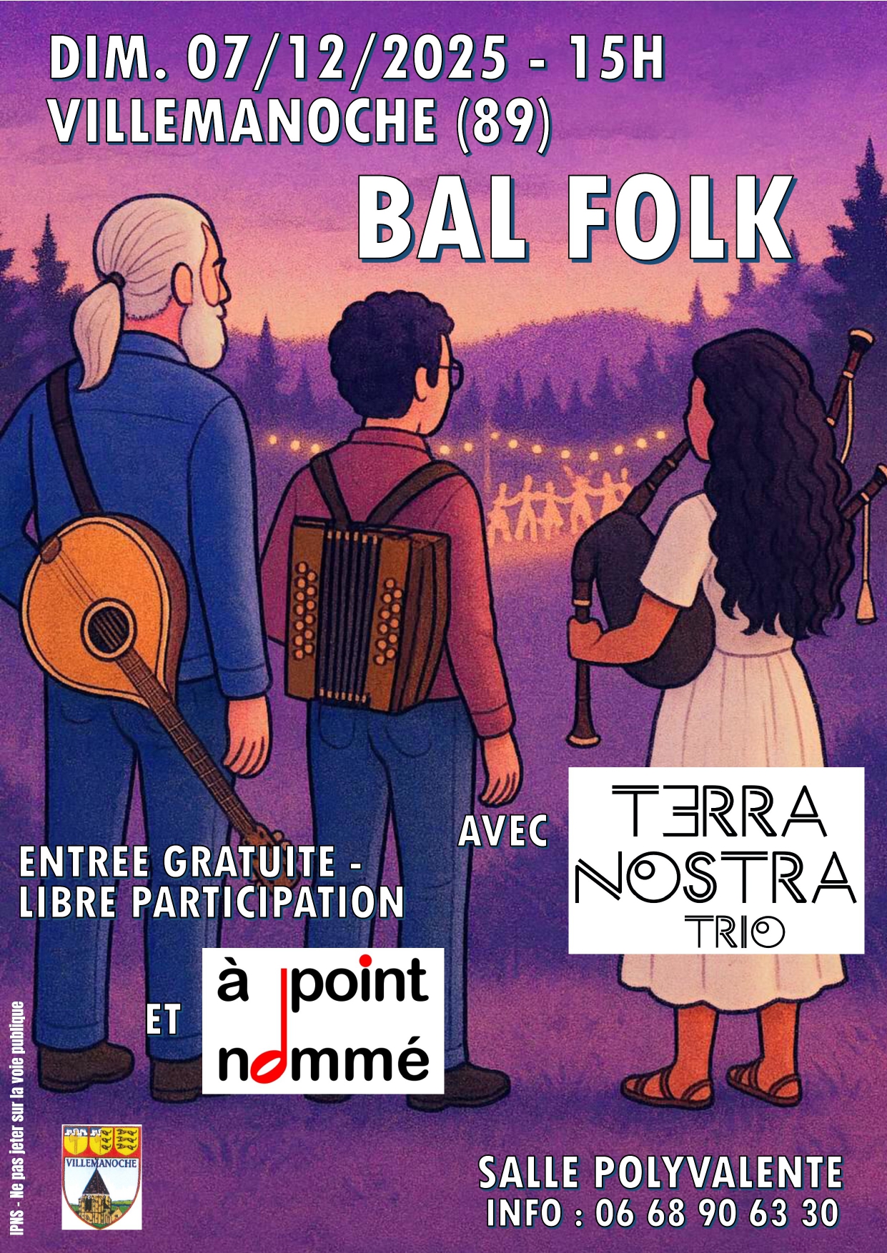 BAL FOLK organisé par l'association La Pierre de Minuit, le dimanche 7 décembre 2025 de 15h à 18h, avec les groupes musicaux À POINT NOMMÉ et TERRA NOSTRA TRIO, à la Salle Polyvalente de Villemanoche,