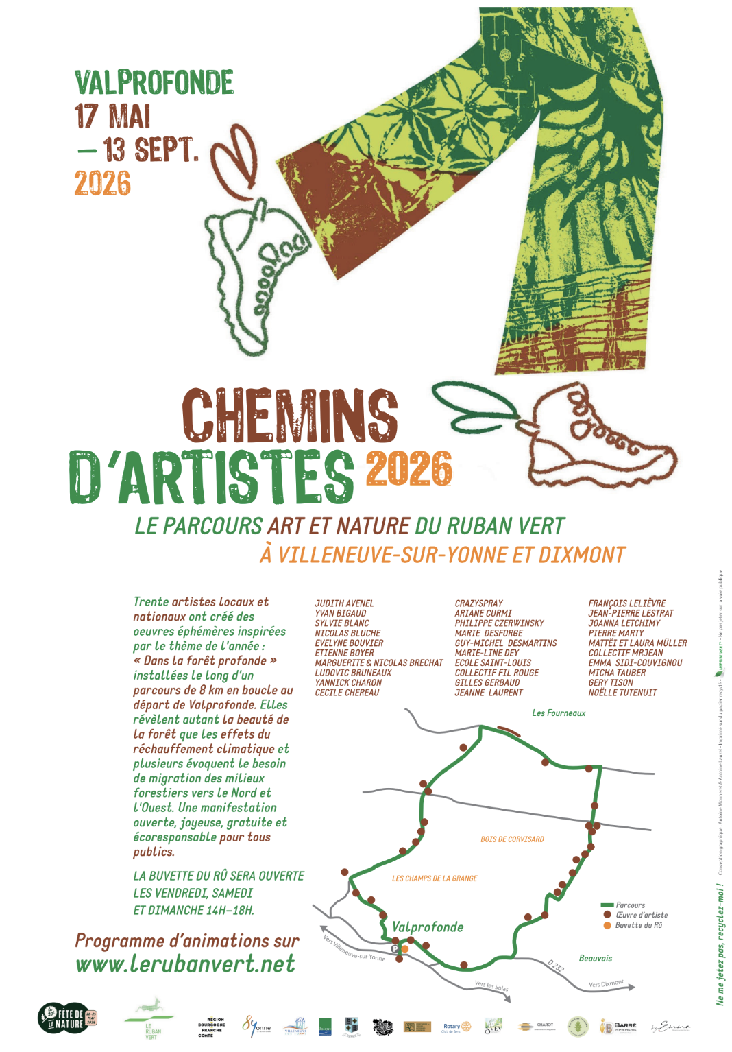 L’association Le Ruban Vert, fondée il y a 10 ans pour protéger et restaurer la biodiversité et les continuités écologiques dans le nord de l’Yonne, organise depuis 2022 sur ce territoire une biennale originale : Les Chemins d’artistes (17 mai / 13 septembre 2026). Il s’agit d’une exposition d’art contemporain en plein air, sur un parcours de plusieurs kilomètres dans la campagne et la forêt, gratuit et accessible à tout moment, où plus d’une vingtaine d’artistes viennent créer des oeuvres éphémères in situ dans les sites de leur choix.