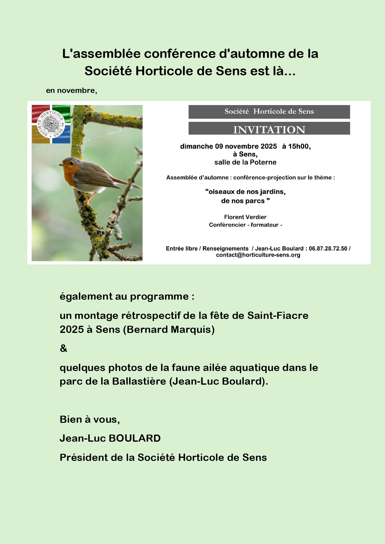 Conférence-projection sur le thème : "Oiseaux de nos jardins, de nos parcs", également au programme un montage rétrospectif de la fête de Saint-Fiacre 2025 à Sens (Bernard Marquis) et quelques photos de la faune ailée aquatique dans le parc de la Ballastière (Jean-Luc Boulard).