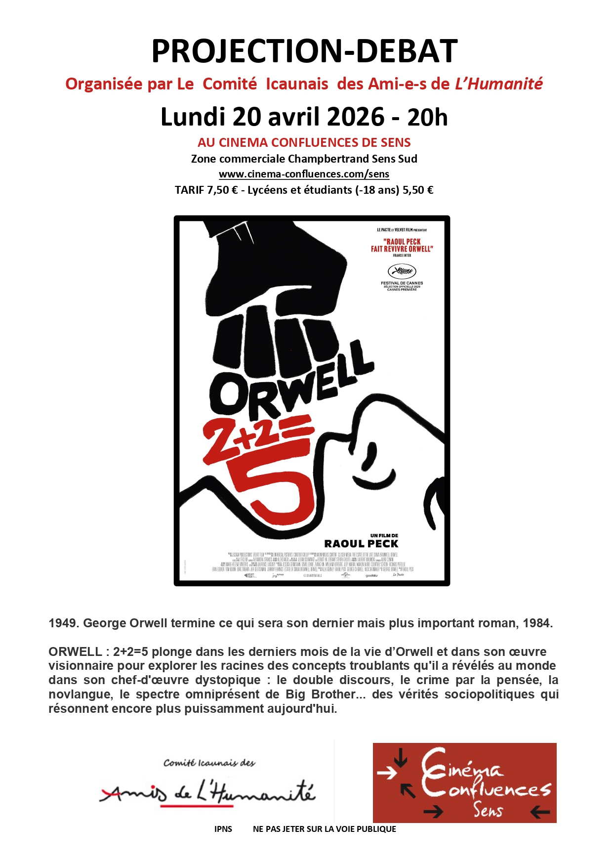 Projection-débat organisée par le Comité Icaunais des Amis-e-s de l'Humanité du film Orwell : 2+2=5