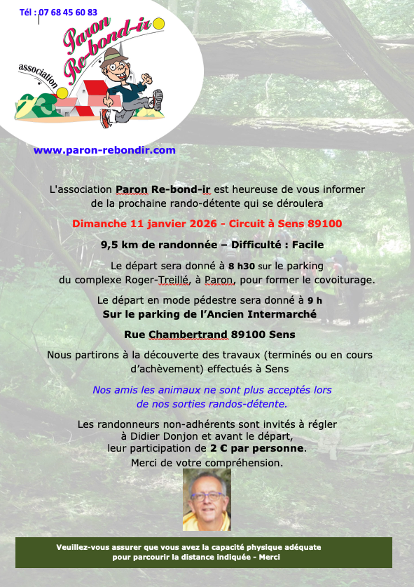 L'association Paron Re-bond-ir est heureuse de vous informer le prochaine rando-détente avec un circuit facile de 9,5km.