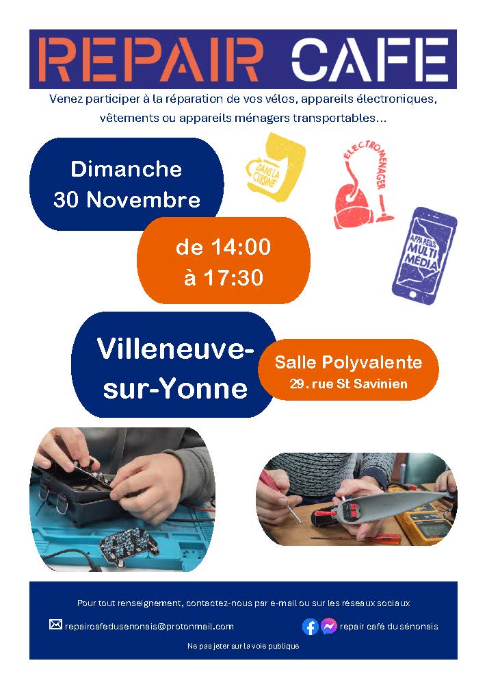 Repair Café du Sénonais Salle polyvalente 29 Rue Saint-Savinien 89500 VILLENEUVE-SUR-YONNE Voir mon itinéraire