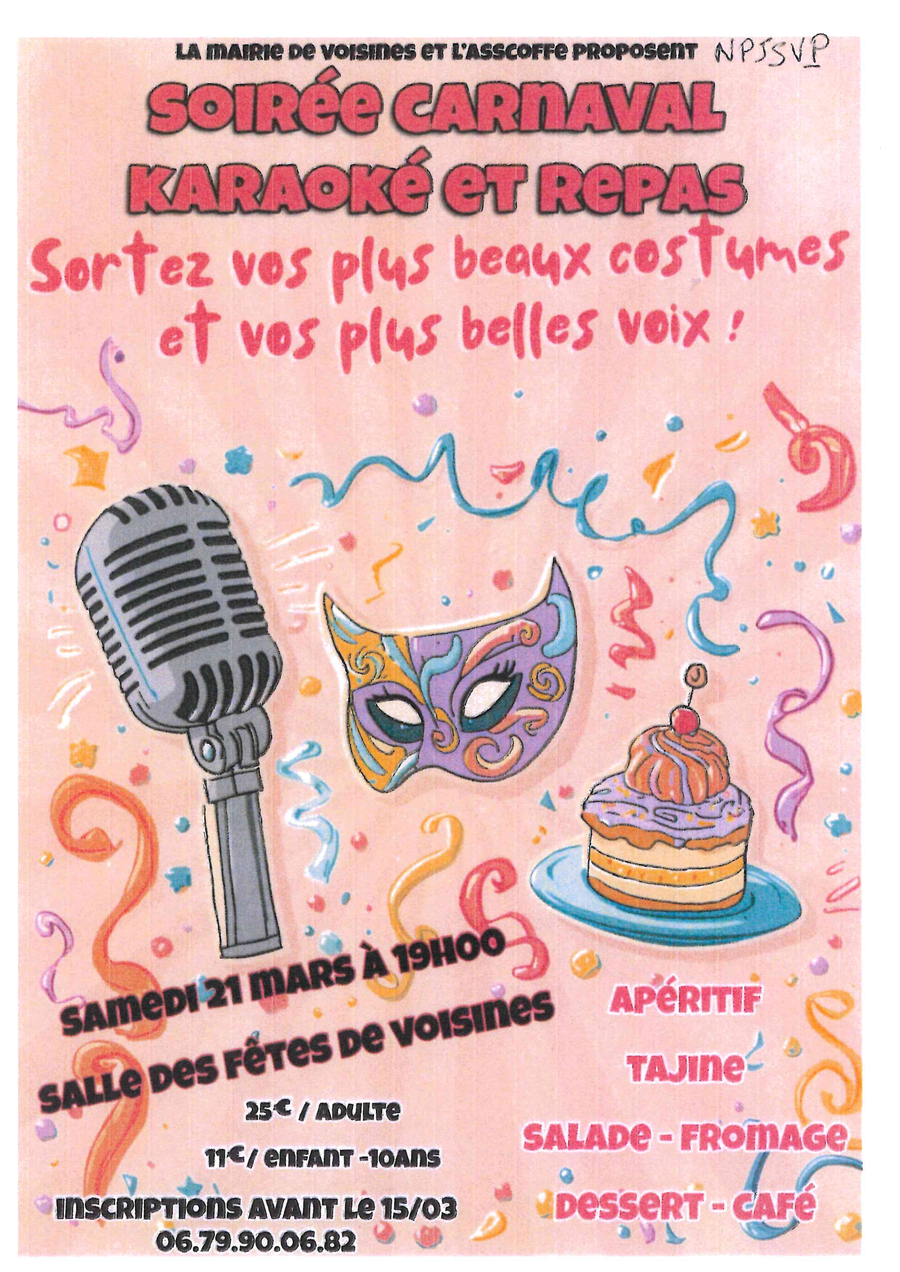 Soirée carnaval karaoké Salle des fêtes 28 Grande Rue 89260 VOISINES Voir mon itinéraire