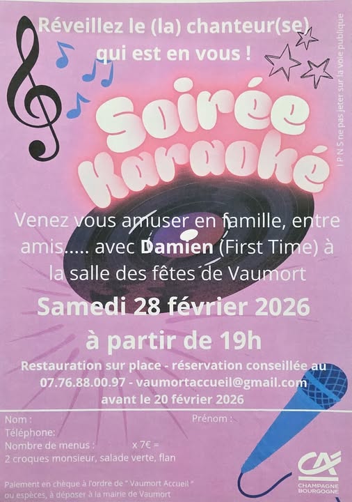 Soirée karaoké Salle des fêtes 20 Route de Paris Genève 89320 VAUMORT Voir mon itinéraire
