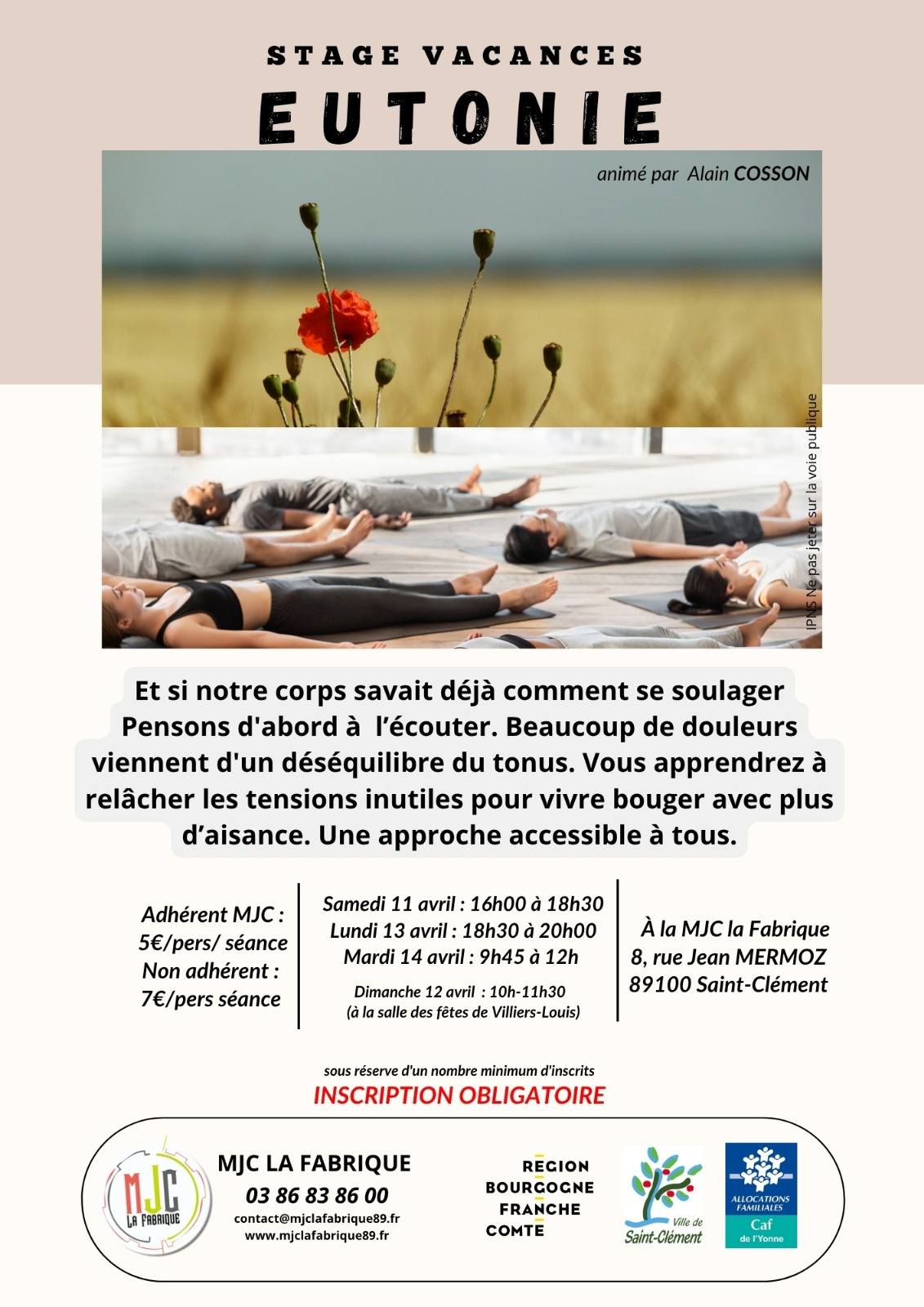 Stage vacances eutonie MJC La Fabrique 8 Rue Jean Mermoz 89100 SAINT-CLEMENT Voir mon itinéraire