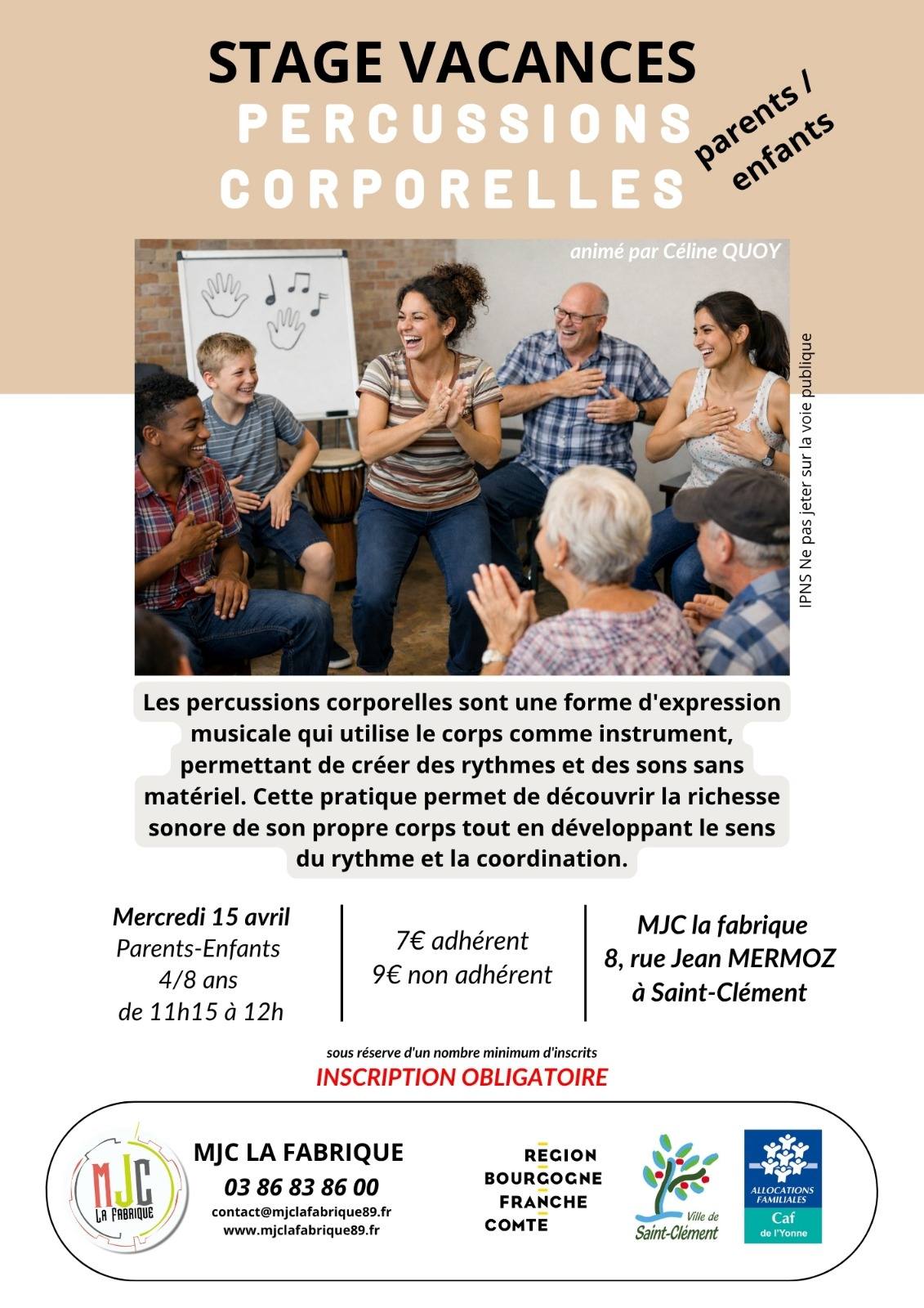Stage vacances percussions corporelles parents/enfants MJC La Fabrique 8 Rue Jean Mermoz 89100 SAINT-CLEMENT Voir mon itinéraire