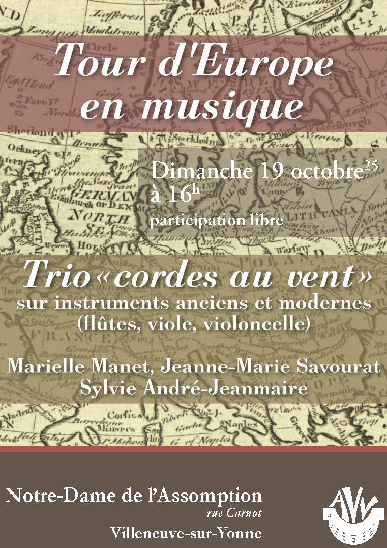 Tour d’Europe en musique par le trio Marielle Manet Jeanne-Marie Savourat et Sylvie André-Jeanmaire Église Notre-Dame de l'Assomption Place Briard 89500 VILLENEUVE-SUR-YONNE Voir mon itinéraire