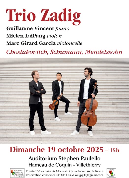L'association Rencontres Culturelles du Gâtinais en Bourgogne - RCGB a le grand plaisir de vous annoncer que le Trio Zadig donnera le prochain concert qui aura lieu le dimanche 19 octobre à 15h au Studio Stephen Paulello à Coquin (Villethierry).