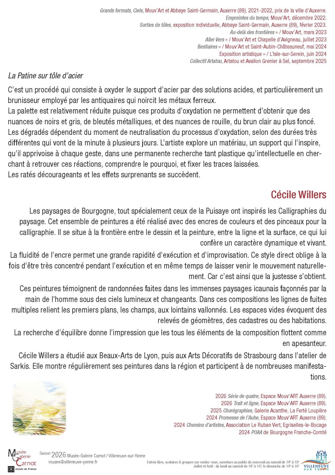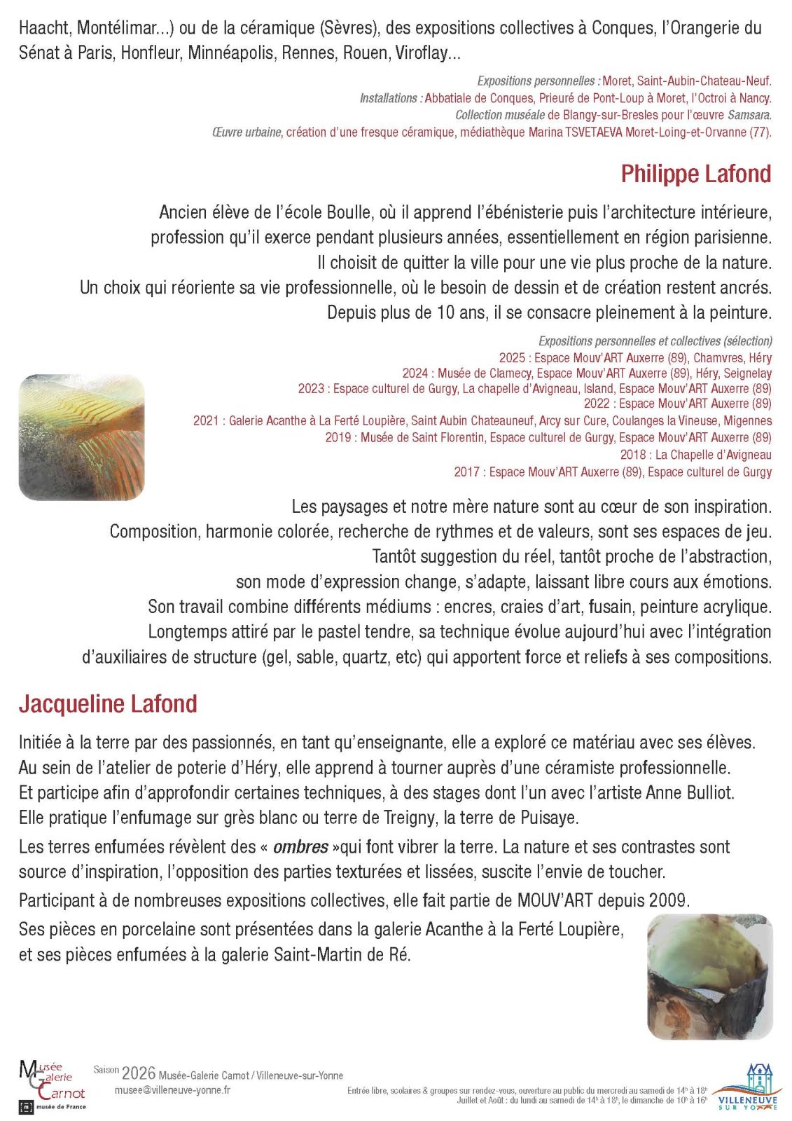 Variations Icaunaises : François Fildier, Corinne Joachim, Philippe Lafond, Jacqueline Lafond, Antoine Maiffret, Jean-Jacques Petit et Cécile Willer Musée-Galerie Carnot 4 Rue Carnot 89500 VILLENEUVE-SUR-YONNE Voir mon itinéraire