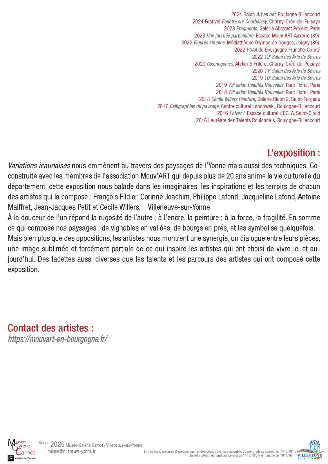L’exposition?Variations icaunaises nous emmènent au travers des paysages de l’Yonne mais aussi des techniques. Coconstruite avec les membres de l’association Mouv’ART qui depuis plus de 20 ans anime la vie culturelle du département, cette exposition nous balade dans les imaginaires, les inspirations et les terroirs de chacun des artistes qui la compose?: François Fildier, Corinne Joachim, Philippe Lafond, Jacqueline Lafond, Antoine Maiffret, Jean-Jacques Petit et Cécile Willers. À la douceur de l’un répond la rugosité de l’autre?; à l’encre, la peinture?; à la force, la fragilité. En somme ce qui compose nos paysages?: de vignobles en vallées, de bourgs en prés, et les symbolise quelquefois.