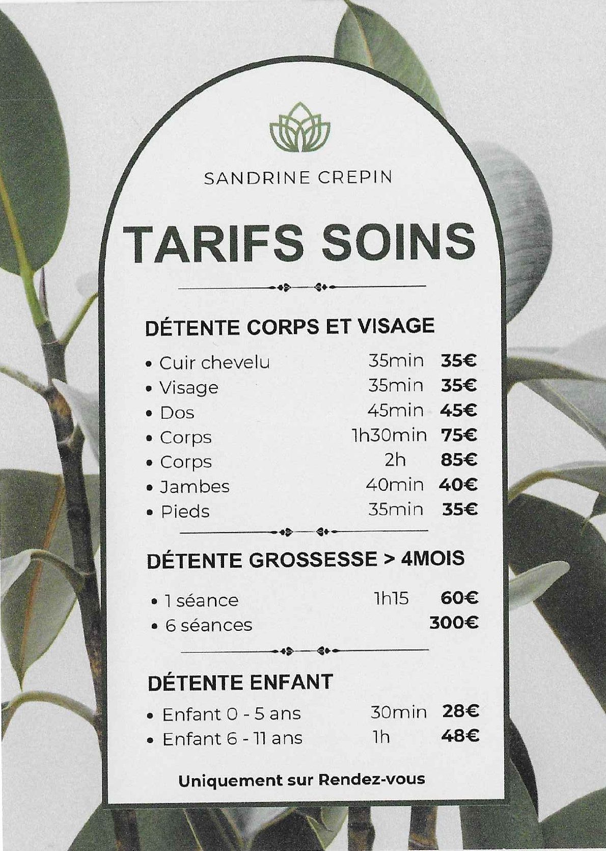 Prestations sur rendez-vous - règlement en espèces ou par chèques.